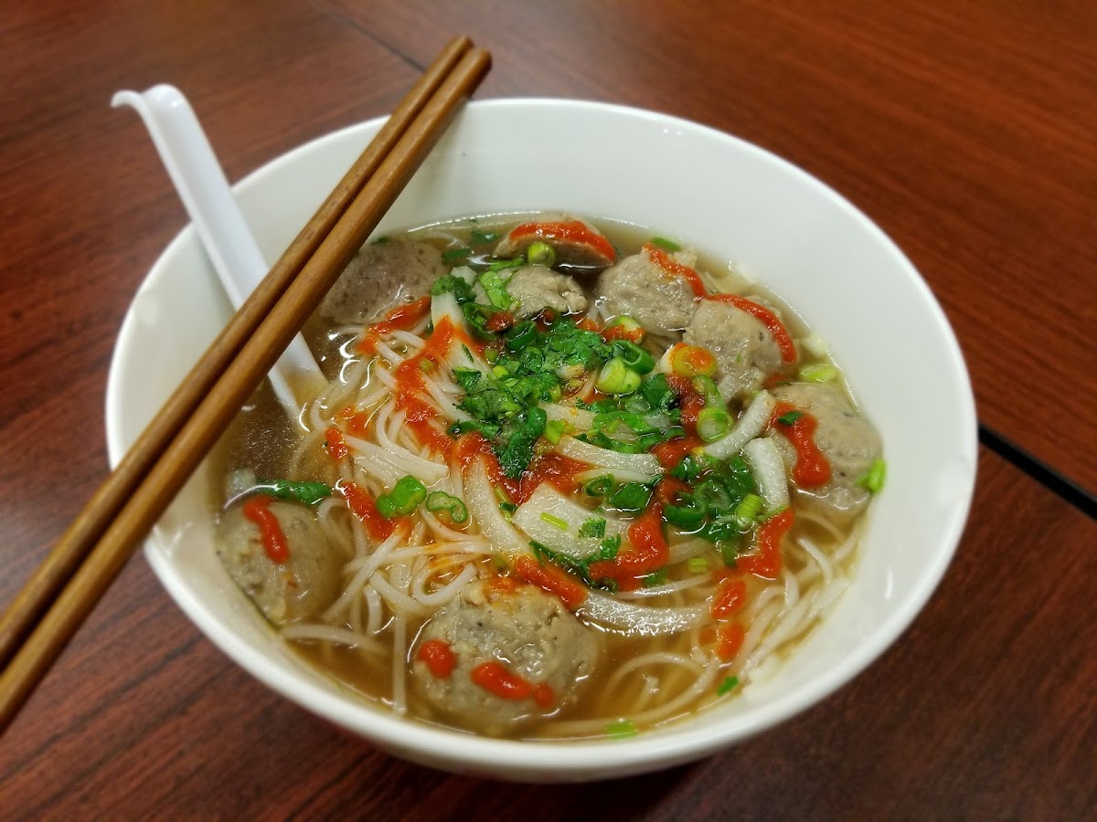 Beef noodle served in beef broth, beef meatballs, sliced beef brisket and tripe, sliced pork and shrimp and imitation crab meat. Served with a side dish with basil leaves, limes, bean sprouts, green leaf lettuce, condiments and garnished with cilantro and green onions