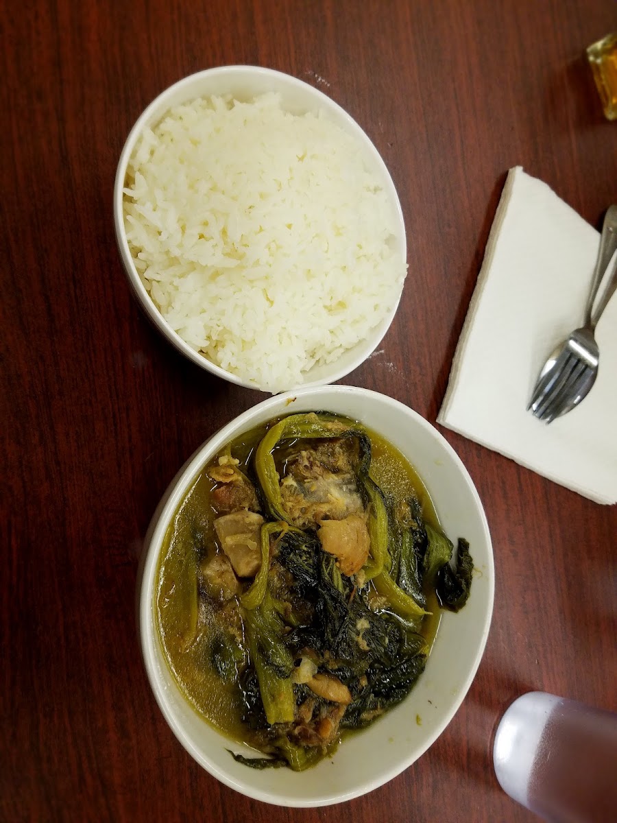 Seasoned pork belly served with sticky rice or jasmine rice and a side of homemade pepper sauce