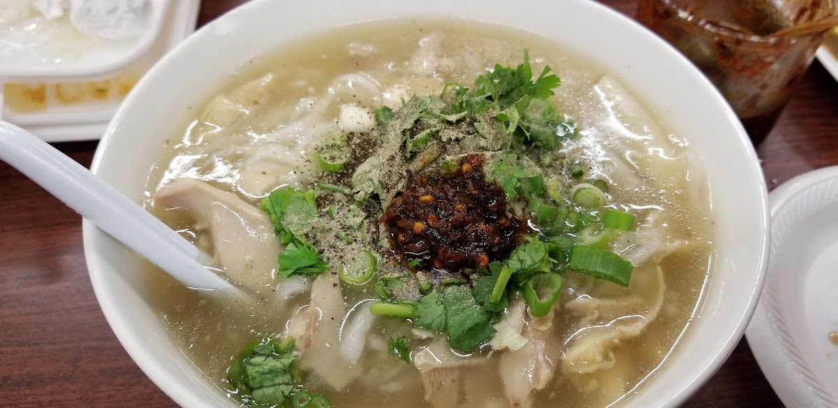 Homemade rice flour noodles boiled in chicken broth with chicken and garnished with green onions and cilantro.